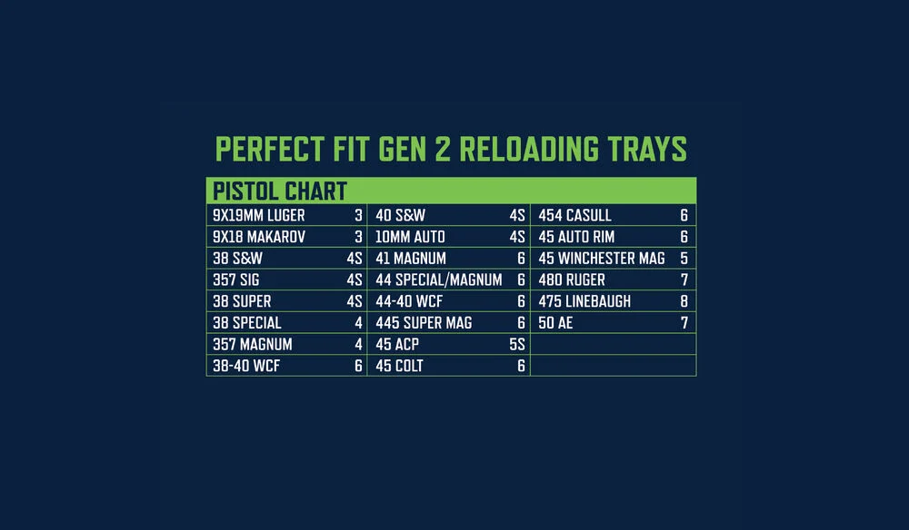Frankford Arsenal’s Perfect Fit Gen 2 Reloading Trays are sized for individual calibers or a family of calibers for a precise fit. These trays are an essential tool for any reloader to maximize efficiency and stay organized. 9 tray sizes are available for many popular rifle and pistol cartridges. Sold in a convenient 2-pack, each tray securely holds 50 cases.