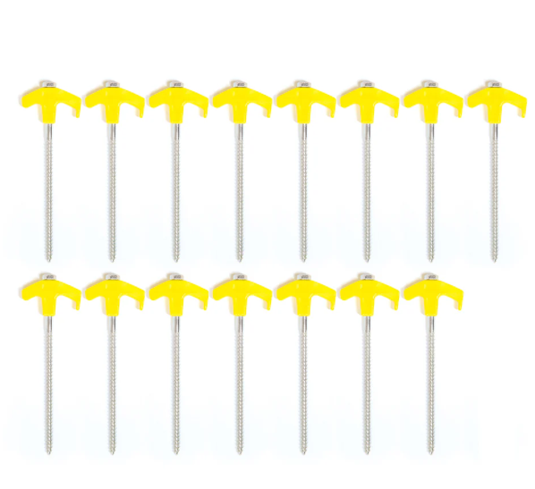The OZtrail 16 piece screw in tent peg set is ideal for hard and rocky ground.