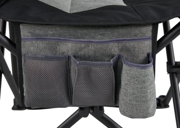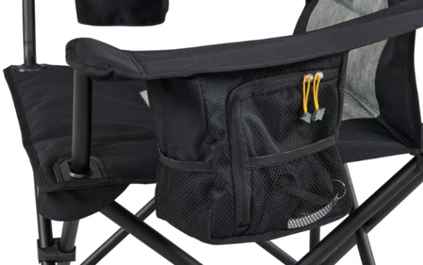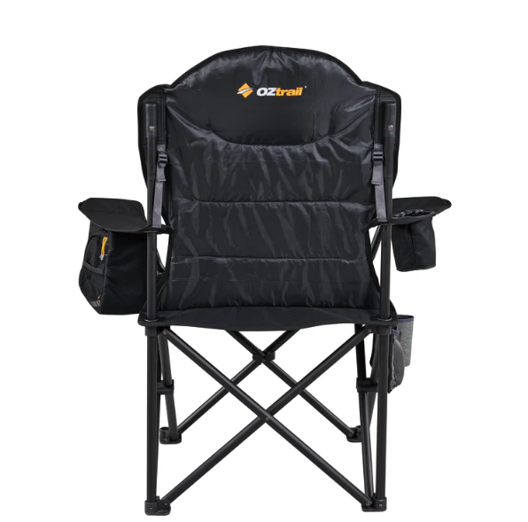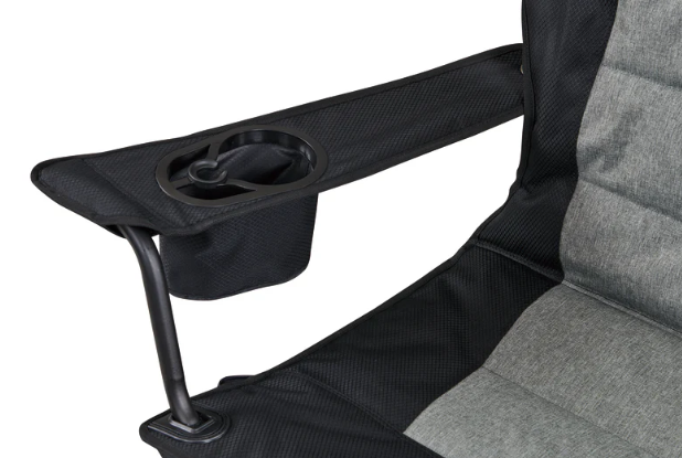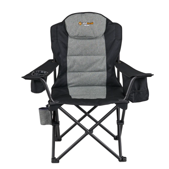 Greater room & capacity but still with a compact chair Extra strength 22mm high-tensile steel frame Double layer padded polyester fabric Cross-bracing hub on front and sides for added strength Comfortable high padded back One large covered insulated drink holder 2 side pockets – one removable Easy to handle compact carry bag