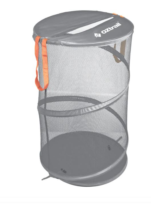 This collapsible laundry hamper is lightweight and portable, perfect for use at home or on the road. It packs flat for easy storage and features two carry handles, a slotted lid, and a mesh body for ventilation.