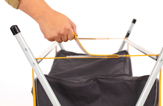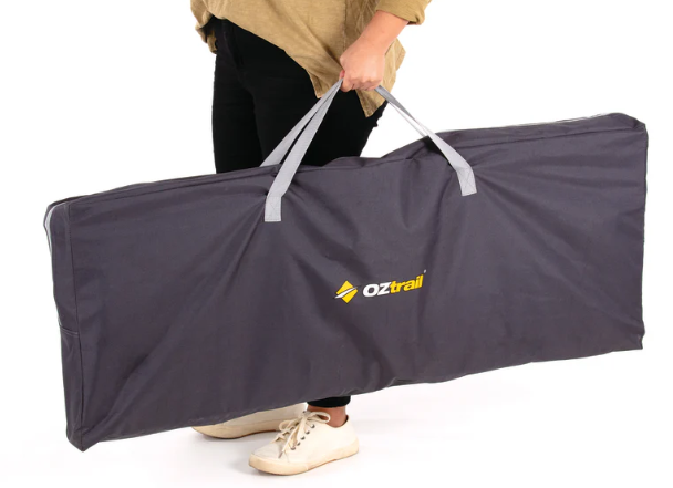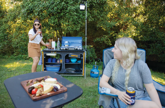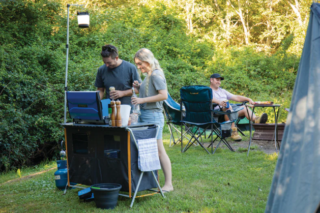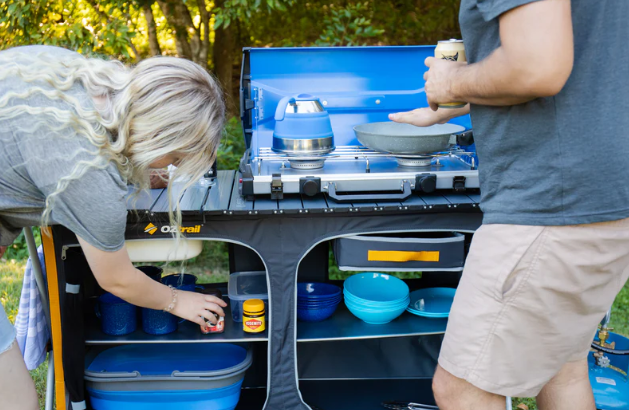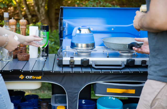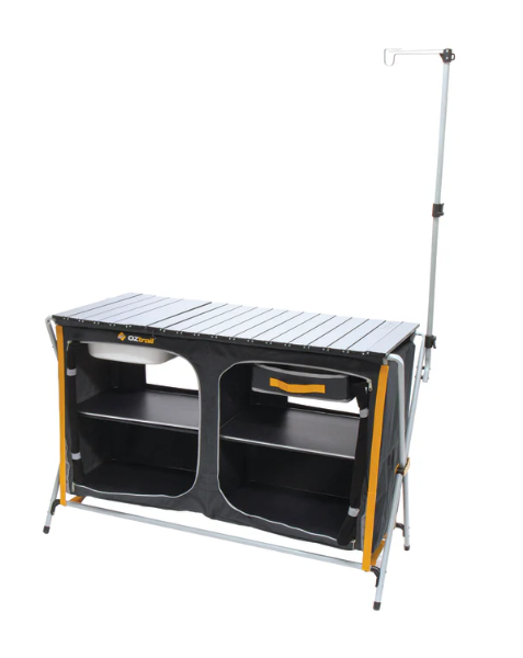 An all-in-one portable camp kitchen with an integrated sink, double cupboard, and a quick setup steel frame. The unit includes a lantern pole, towel rail, and mesh pockets for added storage, making it ideal for camping.