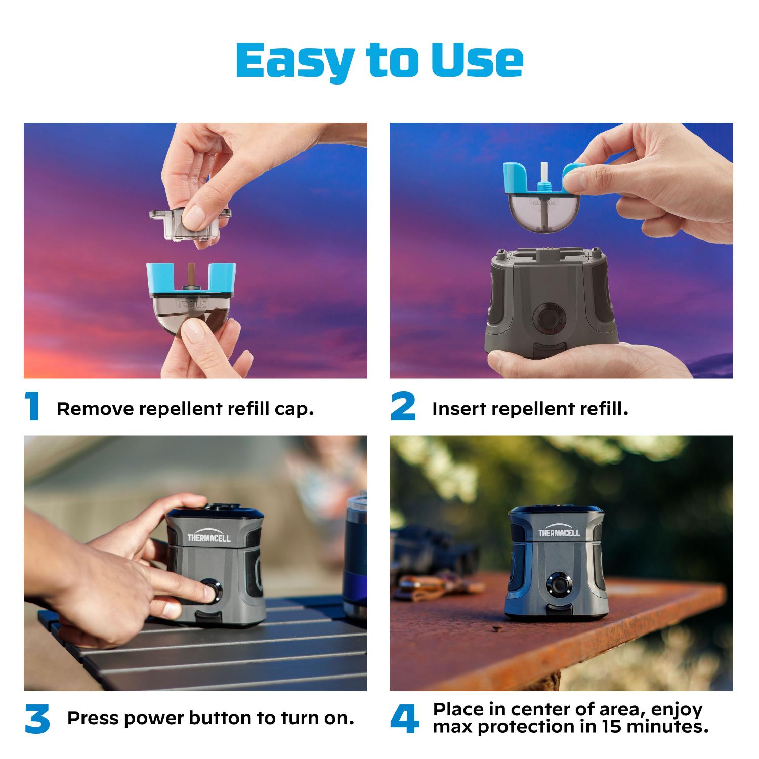 - Includes: One 9-hour rechargeable repeller, one 40-hour refill repellent cartridge, USB charging cable, and lanyard with carabiner.