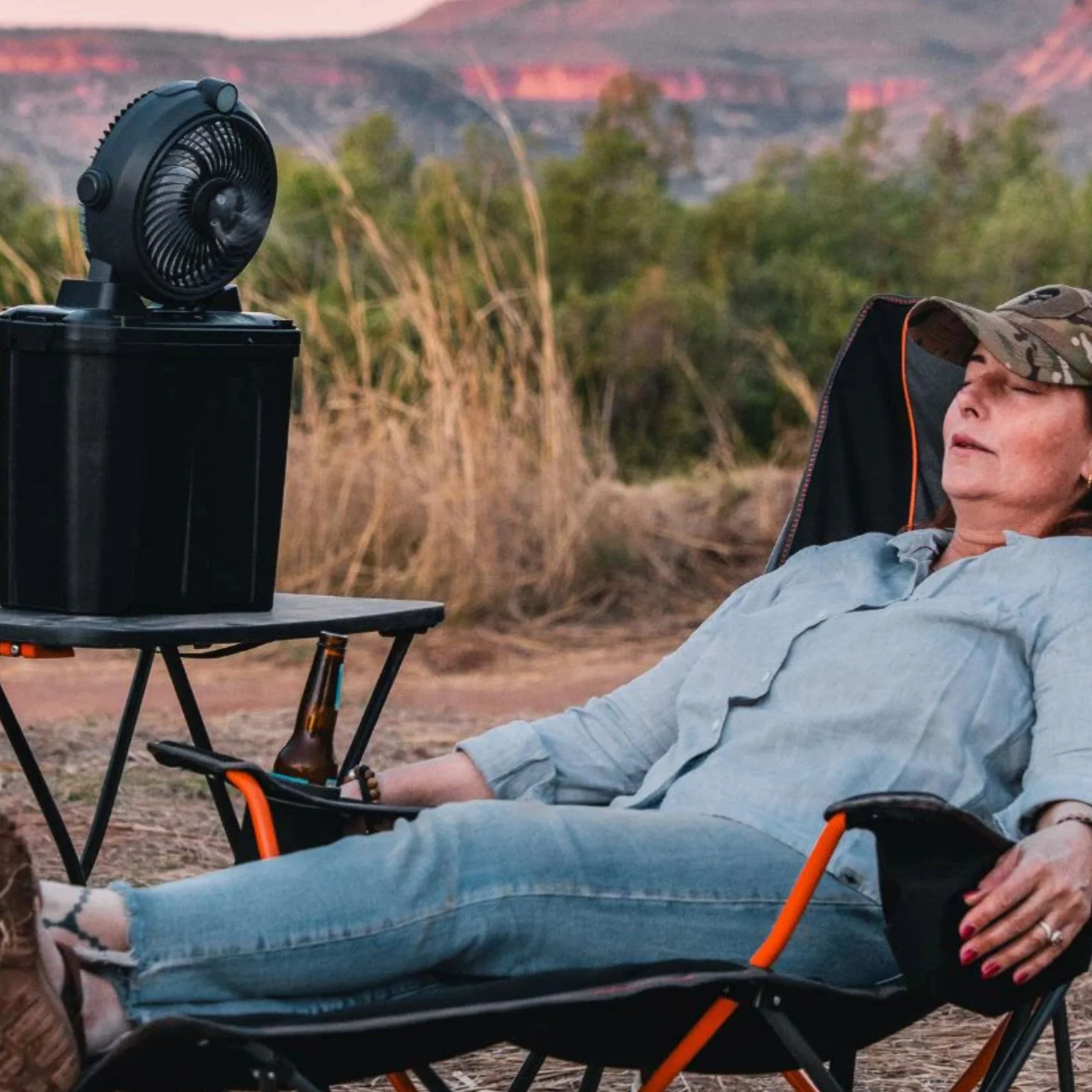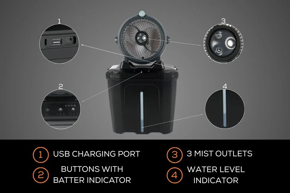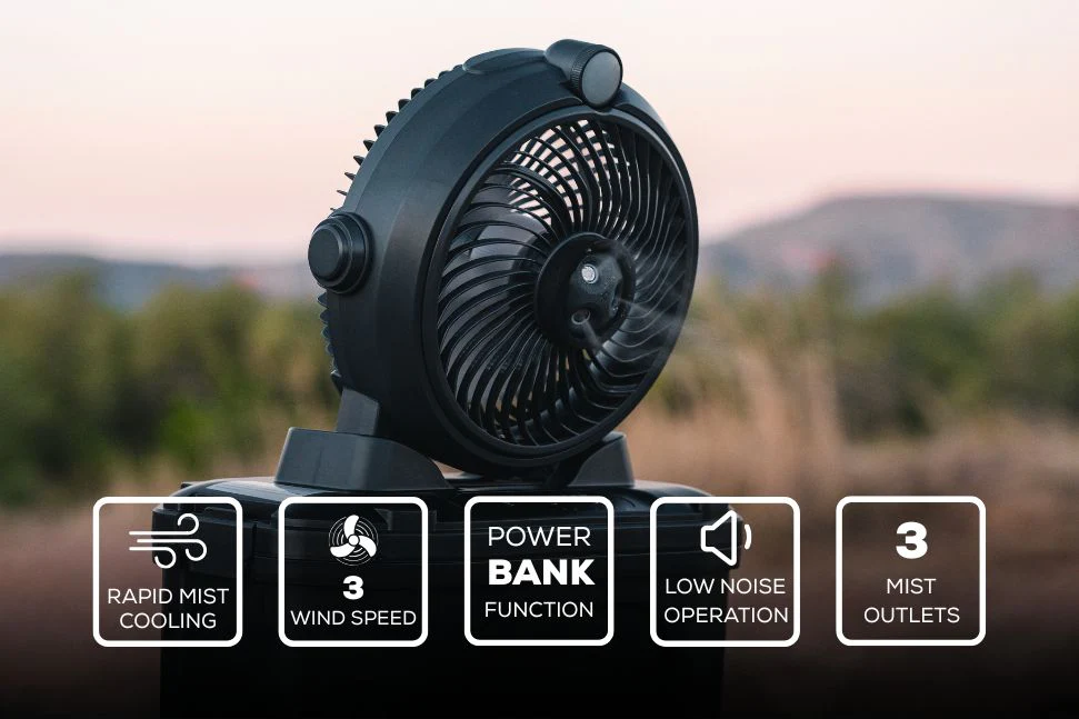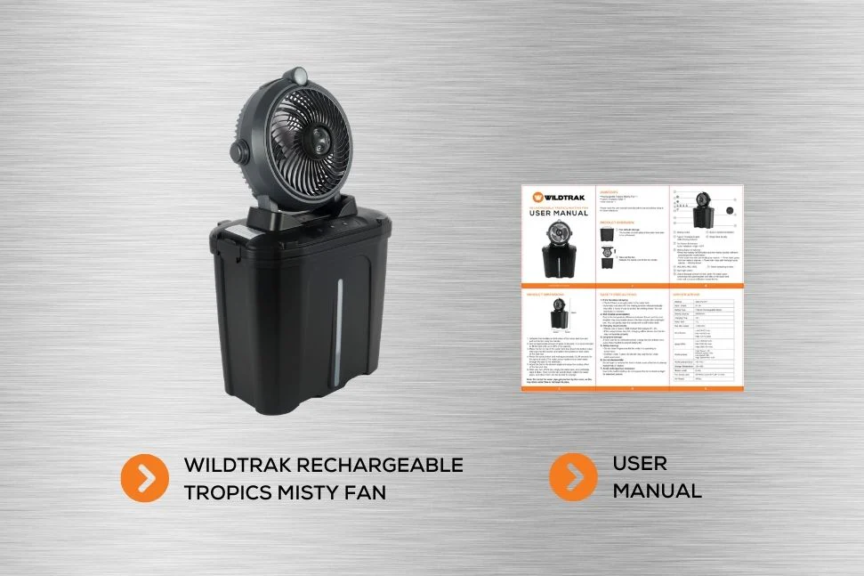 Stay cool anywhere with the Wildtrak Rechargeable Tropics Misting Fan. This portable fan features a powerful 3-hear wind setting and 3 mist outlets for rapid mist cooling, keeping you refreshed even in the hottest conditions. With a 11L large water take and an ultra-quiet motor, its perfect for both indoor and outdoor use. The built-in night light adds a soft glow, while the power bank function keeps you devices charged on the go.